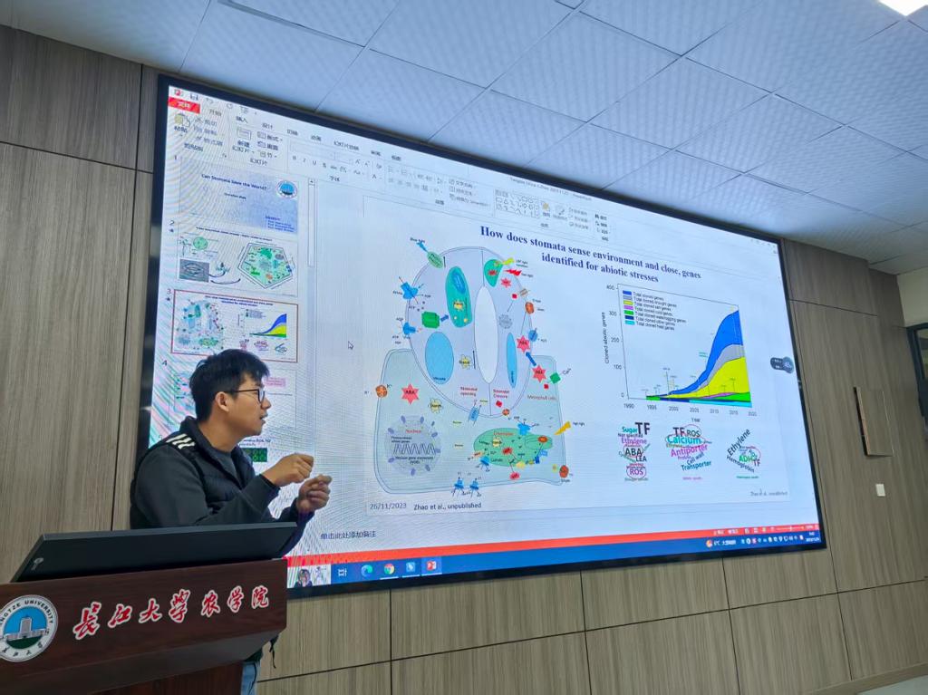 (通讯员 邓锋林)3月31日上午,英国威廉集团求实导师学术沙龙专场活动在农科楼3073举行。活动中,赵晨晨博士作了题为“Can stomata save the world” 的学术报告,围绕植物气孔的分子进化历程及其在环境适应性中的关键作用展开。他结合全球气候变化背景,分析了气孔在调节植物水分利用效率、光合效率以及抵御极端环境方面的重要性。报告介绍了其多年来在干旱、盐胁迫和酸性土壤等典型非生物胁迫条件下,植物气孔适应性机制方面的研究成果,尤其是在解析叶绿体磷酸代谢信号分子在调节气孔开闭和植物干旱胁迫响应中的新进展。这些研究及取得的成果为培育环境适应性作物品种提供了新的理论支撑与种质资源。