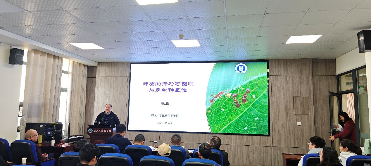 陈立教授从微观生态学的角度,深入探究蚜虫这一常见害虫复杂而精妙的生存策略及其防控措施。他重点介绍了蚜虫和蚂蚁这对自然界经典“CP”的互惠共生秘密,揭示了蚂蚁和蚜虫更隐秘的沟通机制。同时,阐述了蚜虫与天敌昆虫之间错综复杂的互作关系网络,展示出蚜虫惊人的行为可塑性。陈立教授的报告充满了科学的思辨性,揭示了微观世界中所蕴含的宏大生态规律,其前沿的研究视角和严谨的科学论证给师生们留下了深刻印象。