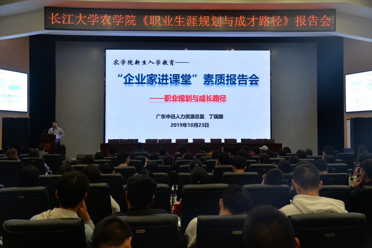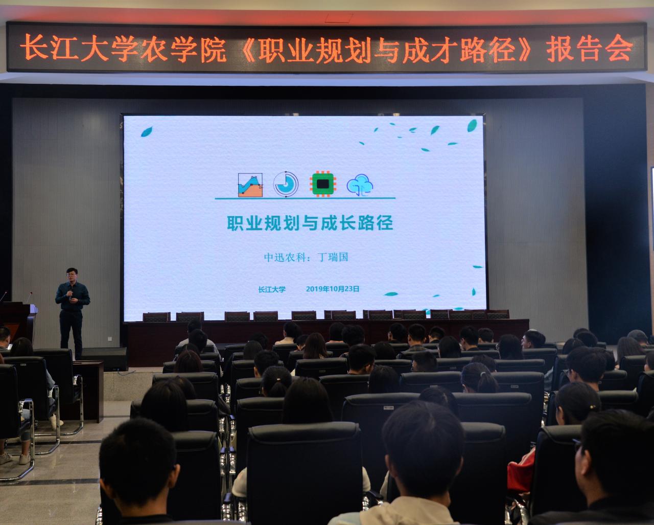 新闻网讯(见习记者 李建平)为帮助在校大学生树立正确的职业规划目标。10月23日19:30,我院于农科大楼1058报告厅举行《职业规划与成才路径》报告会。参与此次报告会的企业嘉宾有中迅集团人力资源中心总监丁瑞国、营销总监熊辉、人力资源中心部长胡诚及招聘主管黄谨。此外,党委副书记谭亮魁,辅导员吴钐、万钰、付雪娇及18、19级全体同学也参与了此次报告会。