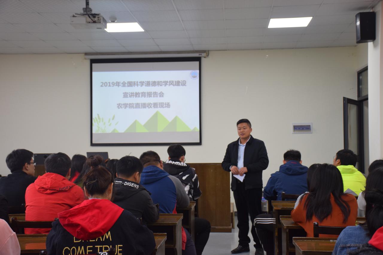 通讯社讯(通讯员 胡义锋)11月13日15:00,我院于在农科大楼3073组织集中观看2019年全国科学道德和学风建设宣讲教育报告会,与会的人员为我院党委副书记谭亮魁,兼职辅导员施秀飞、韩飞和研究生各班代表。此次报告会由研究生会主席谭京红主持。