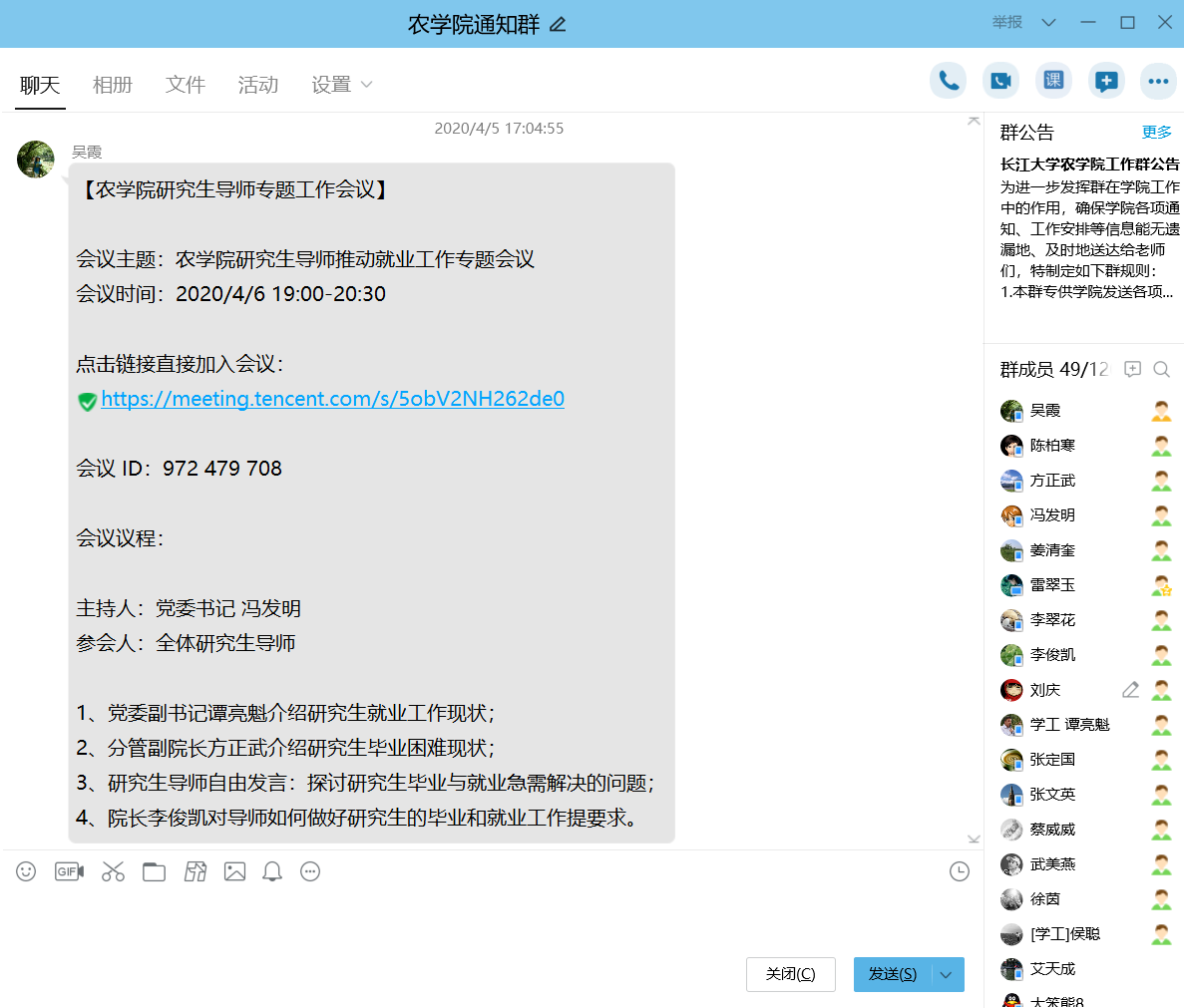 通讯社讯(通讯员 吴霞 刘庆)为进一步做好2020届研究生就业工作,扎实推进研究生毕业生顺利毕业和成功就业,4月6日19:00,英国威廉集团利用“腾讯会议”平台召开研究生导师推动就业工作专题会议。学院院长李俊凯、党委书记冯发明、副院长张文英、副院长方正武、党委副书记谭亮魁、全体研究生导师、各个科室负责人及全体辅导员共55人参加会议。会议由学院党委书记冯发明主持。