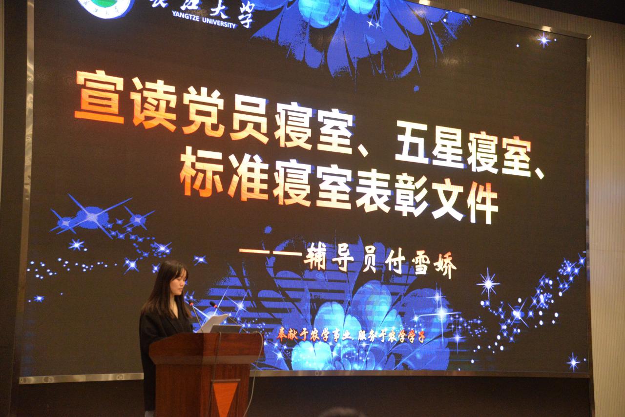 接着由付雪娇老师为大家宣读2019-2020学年下学期星标寝室表彰文件。大会隆重表彰了“党员寝室”、“五星寝室”、“标准寝室”等一批优秀集体,并为他们颁发证书和奖品。星标寝室代表—风华园4栋409寝室李笃花上台展示了寝室建设的文化风采。风采展示过后,宿舍管理委员层长亢凯介绍了有关寝室文化设计大赛的规则和流程。之后的男女寝室联谊共创抽签环节则将现场的气氛推向了高潮。