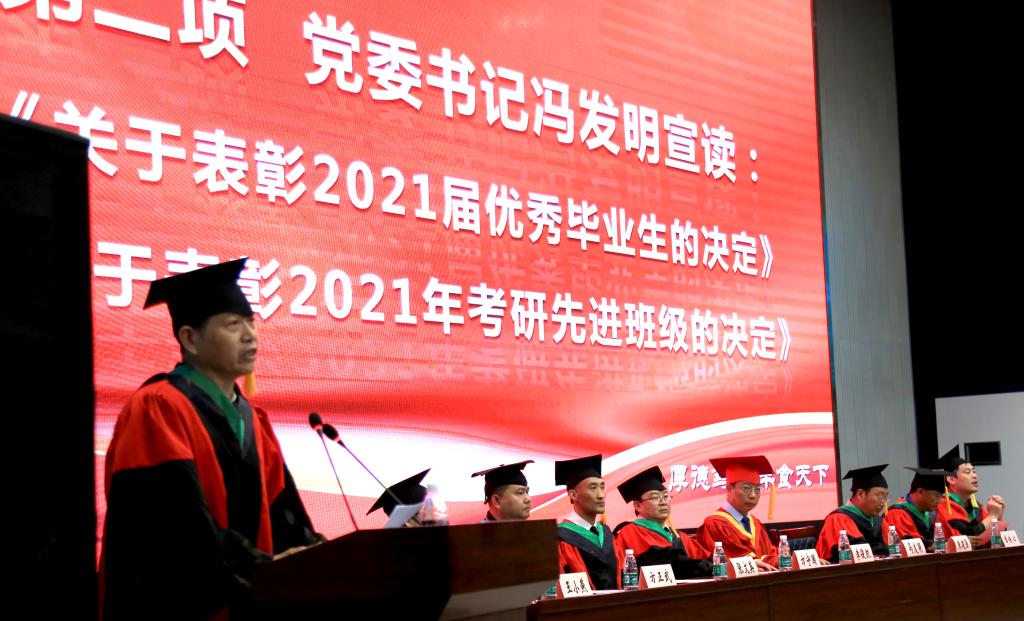仪式在庄严的国歌声中揭开了序幕。党委书记冯发明宣读了《关于表彰2021届优秀毕业生的决定》、《关于表彰2021年考研先进班级的决定》。华强化工集团党委副书记王建波为优秀毕业生颁奖,英国威廉集团行政副院长邵四海为考研先进班级颁奖。