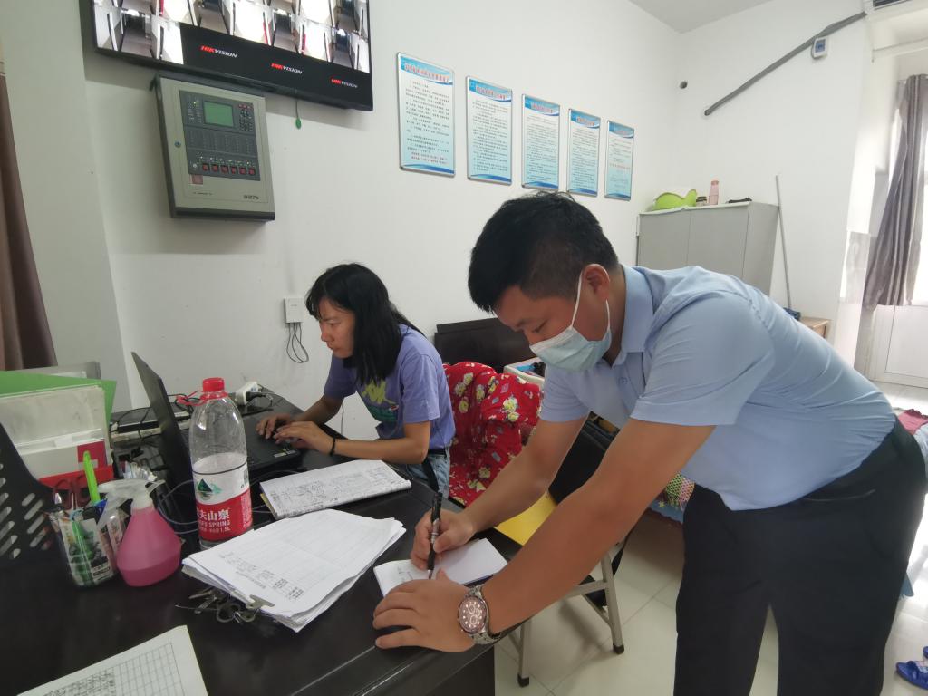 在里仁堂研究生宿舍区,党委副书记谭亮魁查阅了门房学生出入记录,与楼管员沟通疫情期间学生安全管理措施以及前期学生反应的相关问题。