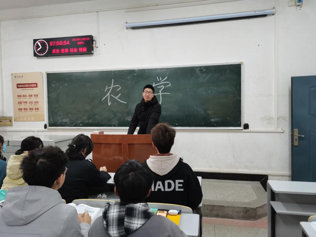 植物类32103班于11月12日在6教107召开了"生涯规划咨询"主题班会。会议主要分为三个环节:知己、知彼、自我探索。在"知彼"环节中学班王荣森讲解了"农学"专业的相关知识以及专业就业前景,班主任马东方老师讲解了"植物保护"专业的相关知识,让同学们有了充足的专业自信。