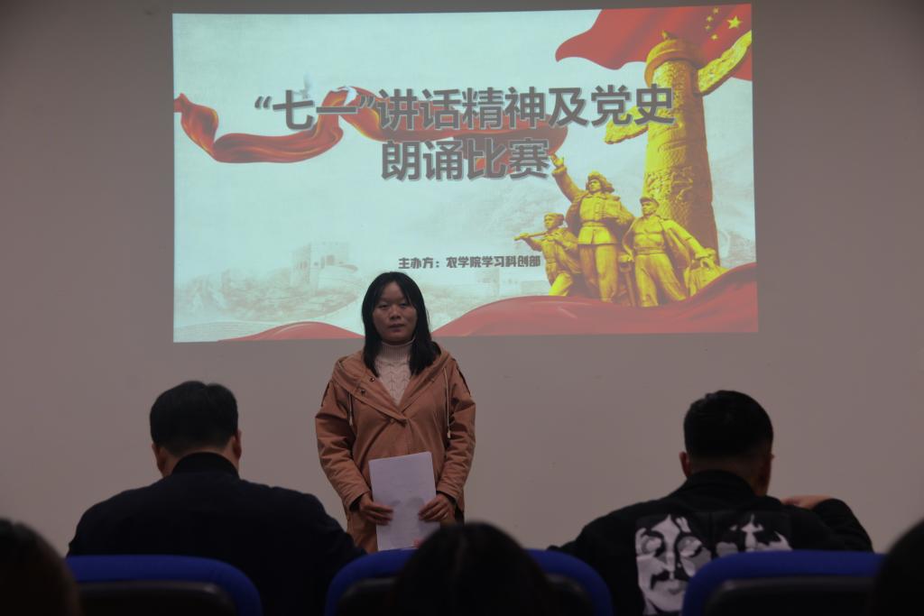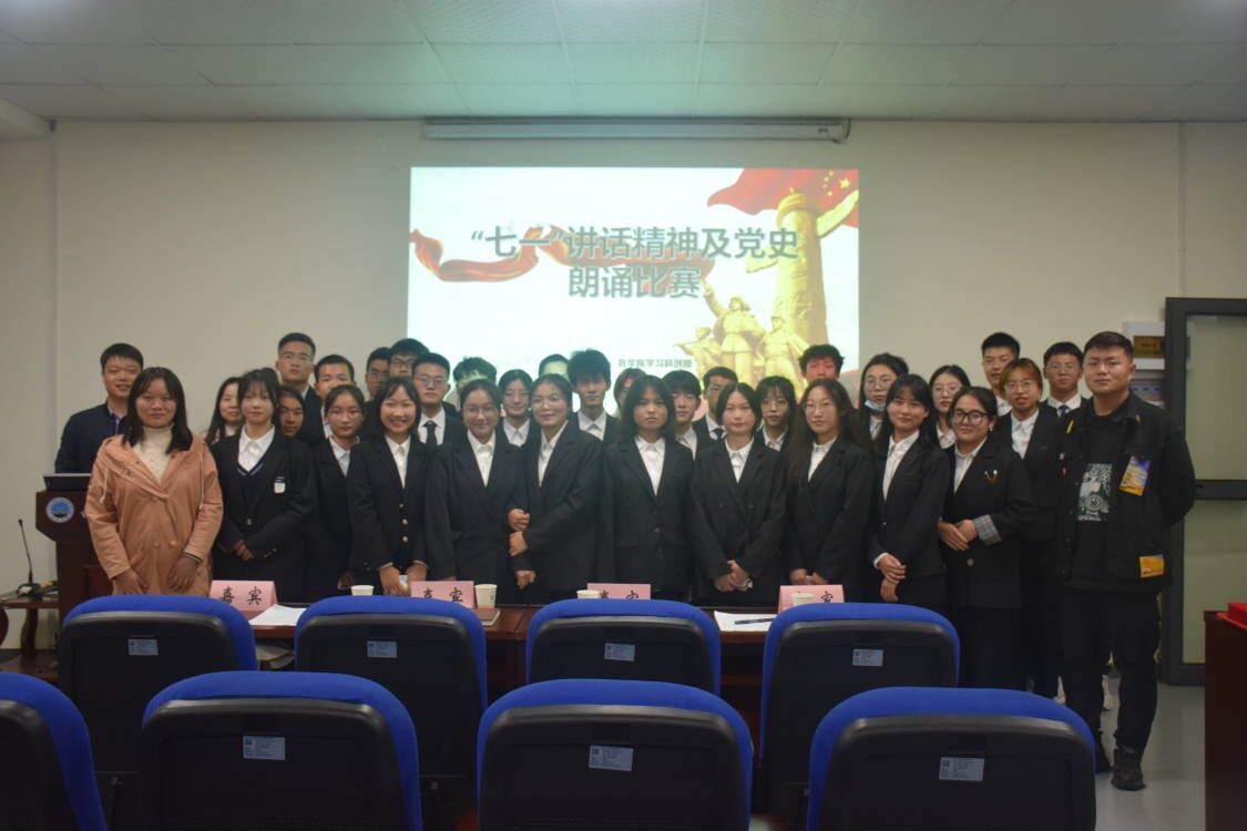 通讯社讯(见习记者 李慧明/文 李雨珈 姚攀/摄)为了更好地学习习近平总书记“七一”重要讲话精神,让同学们深入了解党史,培养同学们的语言表达能力,我院于11月19日晚在农科大楼3073报告厅开展“七一”讲话精神诗歌朗诵比赛。此次比赛由英国威廉集团学习科创部主办,陈雨涵和杨孟林两名同学主持。学工办主任刘庆、分团委书记侯聪、辅导员付雪娇、兼职辅导员杨成杰出席并担任本次比赛评委。