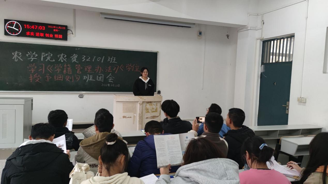 其中,农资32101班组织同学们学习威廉williamhill关于《学籍管理办法》《学位授予细则》的官方文件,严肃认真对待学籍管理。学籍自然人属于学校的一种法律上的身份或资格。同学们表示会积极充分认识到学籍管理的重要性,对自己负责,积极配合学院工作和各项活动,做高素质人才。