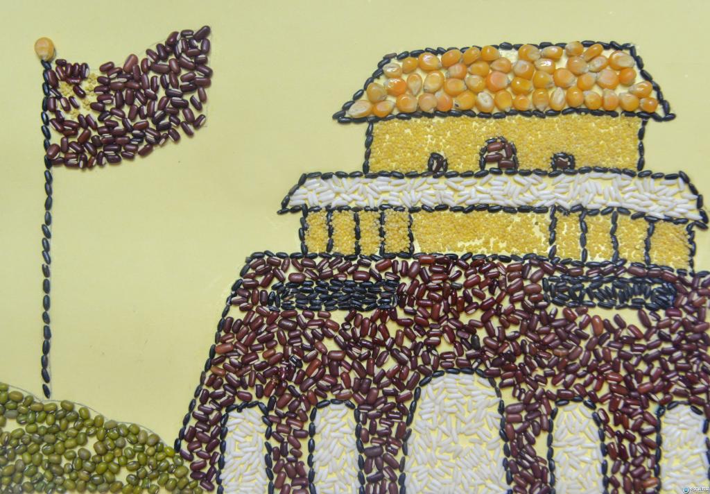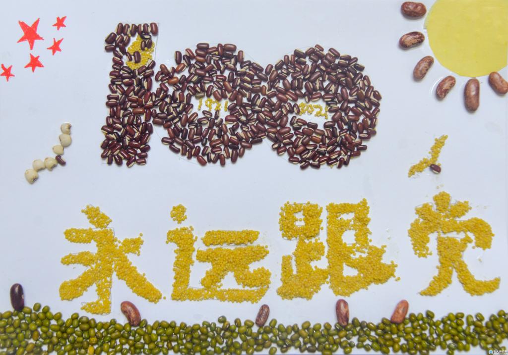 党徽、天安门、五星红旗、神舟飞船……一幅幅色彩鲜明的种艺画作品勾勒出当代青年心中的红色梦想与憧憬,将所思所学化作勤学报国的赤子情怀。“我们用小米、黑米和红豆绘出一座‘长城’,作为中华文明的象征;用不同类别的种子汇聚在一起,寓意生于华夏长于盛世,中华儿女一家亲。”向风云同学说。
