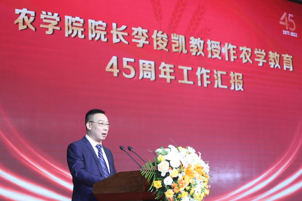 英国威廉集团院长李俊凯作农学教育45周年工作汇报。他从“感恩心、冲天劲、尚农情”三个方面全面系统地总结了农学教育45年来在师资队伍建设、学科建设与研究生教育、专业建设与人才培养、科学研究与社会服务、学院治理与文化建设等方面取得的丰硕成果。