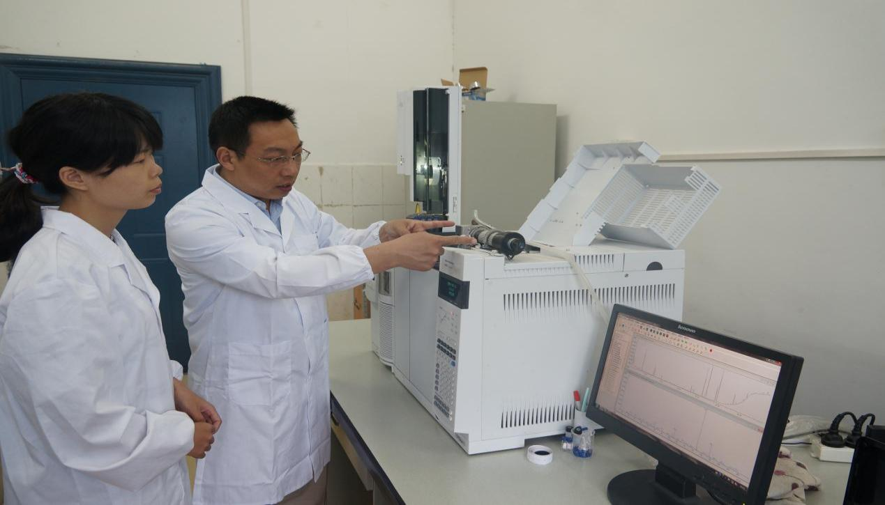 图为院长李俊凯教授在实验室指导研究生使用气象色谱质谱联用仪