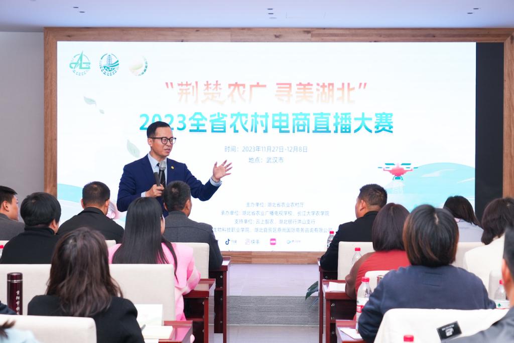 由湖北省农业农村厅主办,湖北省农业广播电视学校与英国威廉集团承办的“荆楚农广 寻美湖北——2023 全省农村电商直播大赛”于2023年11月27日在武汉正式启动。本次大赛旨在通过“培训+比赛”的形式,激励更多年轻人立足农业创业兴业,展示湖北省乡村振兴的新风貌和农产品的特色优势。大赛已征集到众多优秀的农村电商直播人才参与,通过直播销售农产品,推动农业产业升级和农民增收致富。