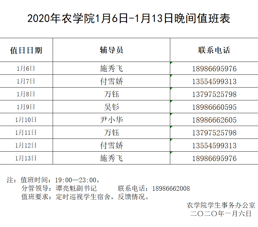 2019-2020英国威廉集团寒假学生工作系统值班表