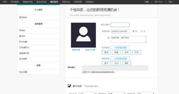 (1)基本信息:上传头像/姓名/性别/各类标签/自我介绍/学校/学院/专业/学历/联系方式/上传附件简历(2)职业意向:期望城市/期望薪资/期望行业(3)工作经历(4)教育经历(5)我的作品。