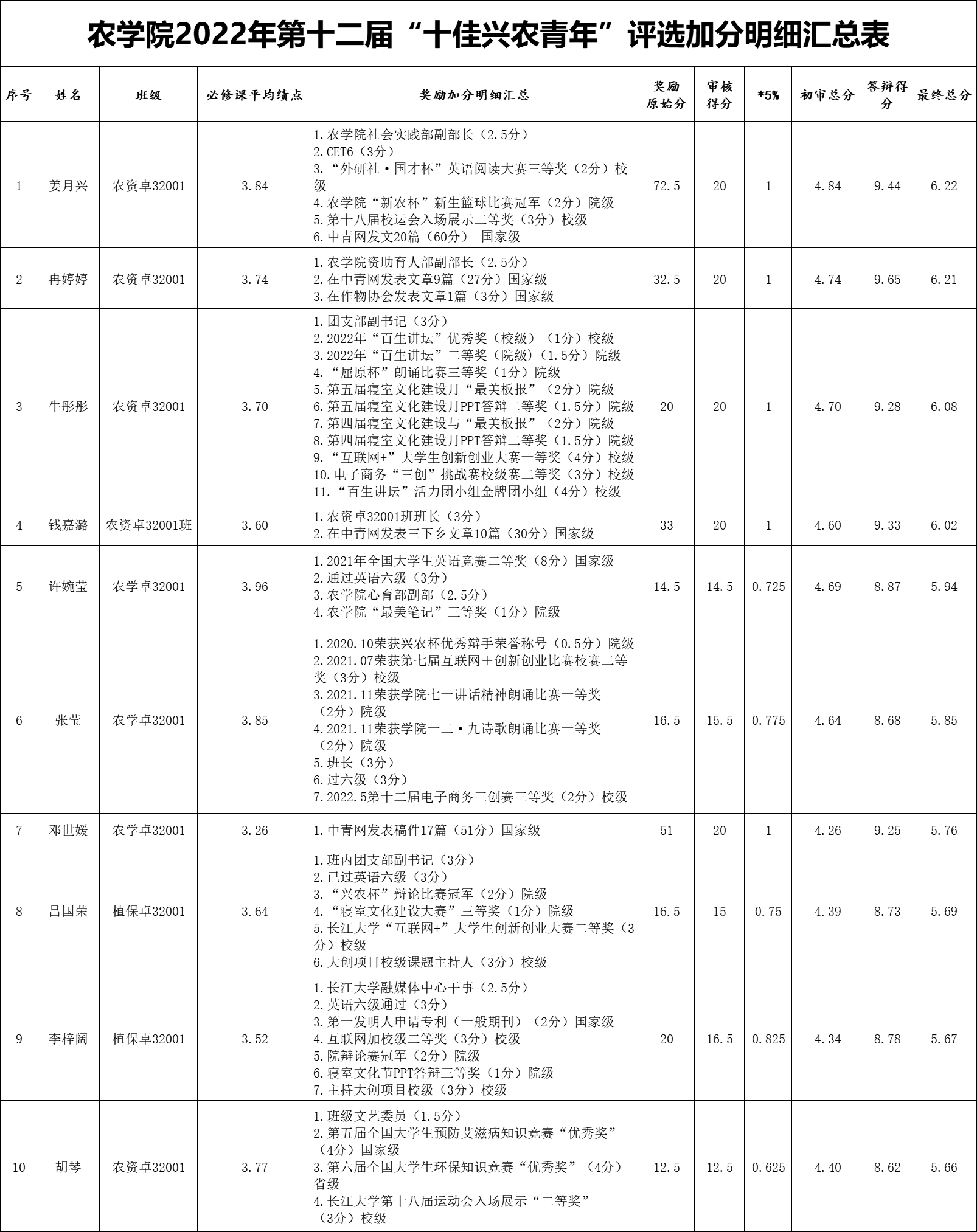为了树立先进典型,充分发挥典型的教育示范作用,有效激励全院学生勤奋学习,形成积极进取、学习先进、崇尚先进、争当先进的良好风气,促进学生全面发展和成长成才,经个人报名、资格审核、个人展示、面试答辩等程序,拟推荐姜月兴等10名同学为本届“十佳兴农青年”候选人。