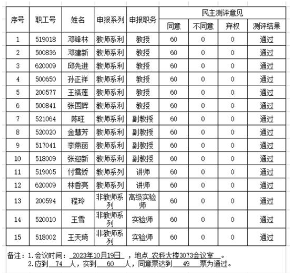 根据学校《关于开展2023年度专业技术职务评聘工作的通知》要求,我院于10月19日下午召开了2023年度专业技术职务评审民主测评会,经各申报人述职、参会高级职务的全体教师投票表决,现将测评结果公示如下: