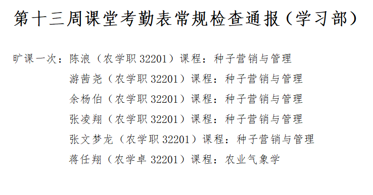 为端正学风、严肃校纪校规,现对全体学生课堂考勤常规检查给予通报。