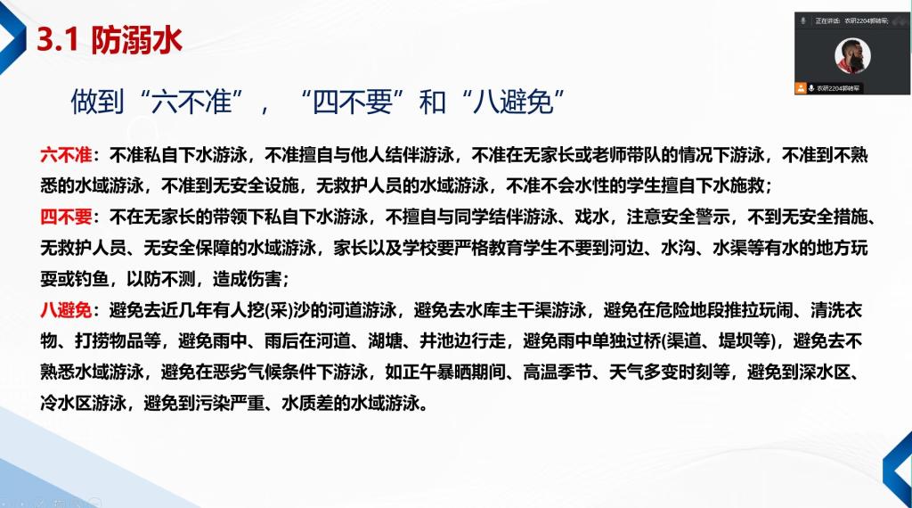 班会上,班级主要围绕交通安全、人身财产安全、食品安全、宿舍用电安全、防诈骗、防溺水等方面进行强调,提醒同学们增强自我防范意识,确保个人及他人的安全。另外,各班级重点摸排了假期离校学生信息,确实掌握离校学生的动向;要求离校同学假期结束后要按时返校,全员参与返校晚点名活动,因事假等延迟返校的,要第一时间上报课题组负责人。