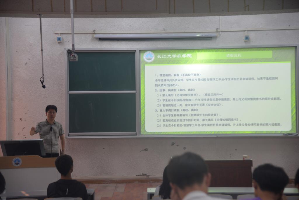 接着,黄老师向同学们提出学业规划同样不容忽视,提醒同学们做好学业课程、实习实训的规划,为未来的职业发展奠定坚实基础。由于国庆假期将至,辅导员黄承石老师还对请假离校流程进行了解读,明确了请假的规范和要求,以此来保障学生的安全和正常的教学秩序。