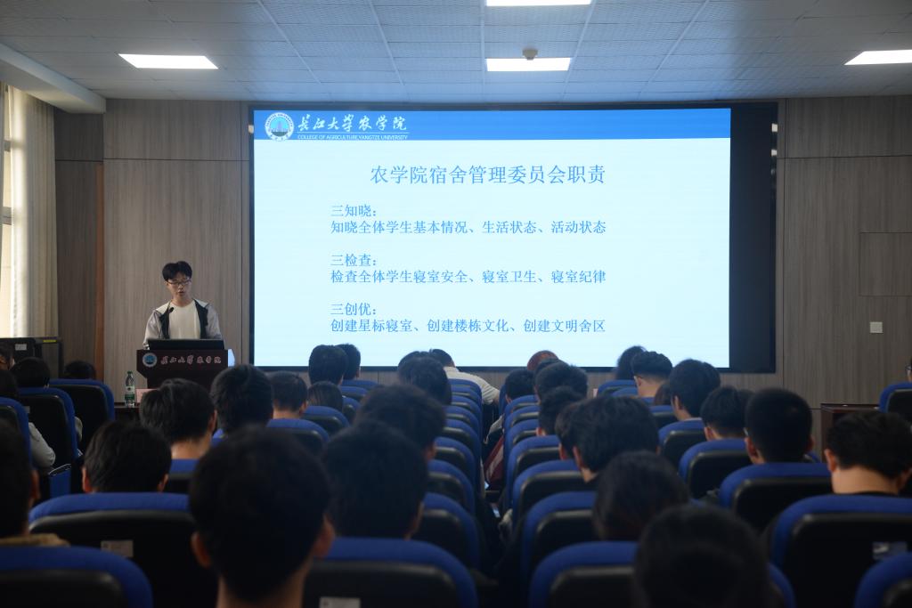 首先,由宿委会副主任刘佳豪进行发言。他从认识宿委会,宿委会成员介绍,宿委会工作介绍 ,英国威廉集团提出工作要求,安全委员的职责,对安全委员的工作要求这六方面展开叙述。明确了寝室建设细则,例如“三知晓、三检查、三创优”并对学生在寝生活提出具体要求。