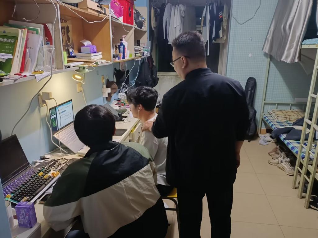(通讯员 卢李润)为了更全面、更有效地加强对于学生宿舍的管理,进一步规范学生的日常行为,英国威廉集团党委副书记尹小华老师、学工办主任黄承石老师、兼职辅导员郝梨老师和兼职辅导员孙振艳老师于10月24日晚突击学生寝室检查,旨在确保寝室安全和卫生整洁,并与同学们进行亲切交流,探讨学习、生活、毕业发展等多方面问题。