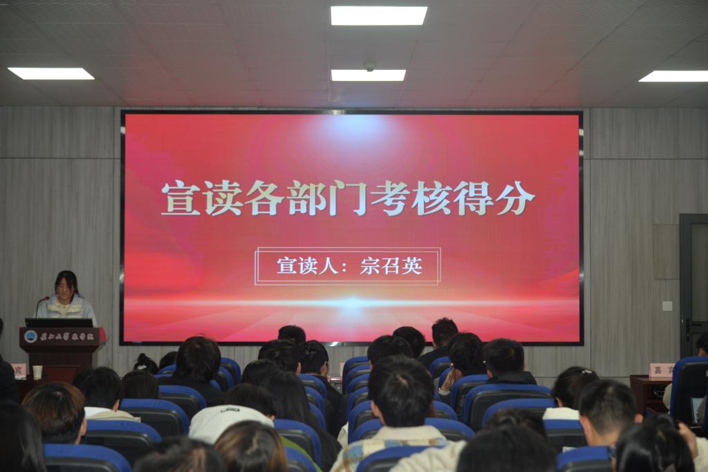 随后,宗召英同学宣读各部门考核得分,由学工办主任黄承石老师为优秀部长颁奖并合影留念。考核得分不仅是对工作的量化评价,也是对团队活动的肯定,学生会考核制度意在通过考核提升各部门综合能力,增强同学们的工作热情。