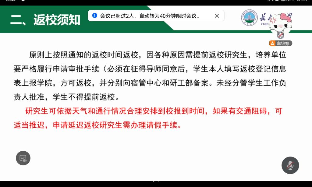 此次会议提升了研究生的安全意识,使同学们更全面地了解开学的相关要求和注意事项,为同学们新学期顺利返校提供了安全保障。
