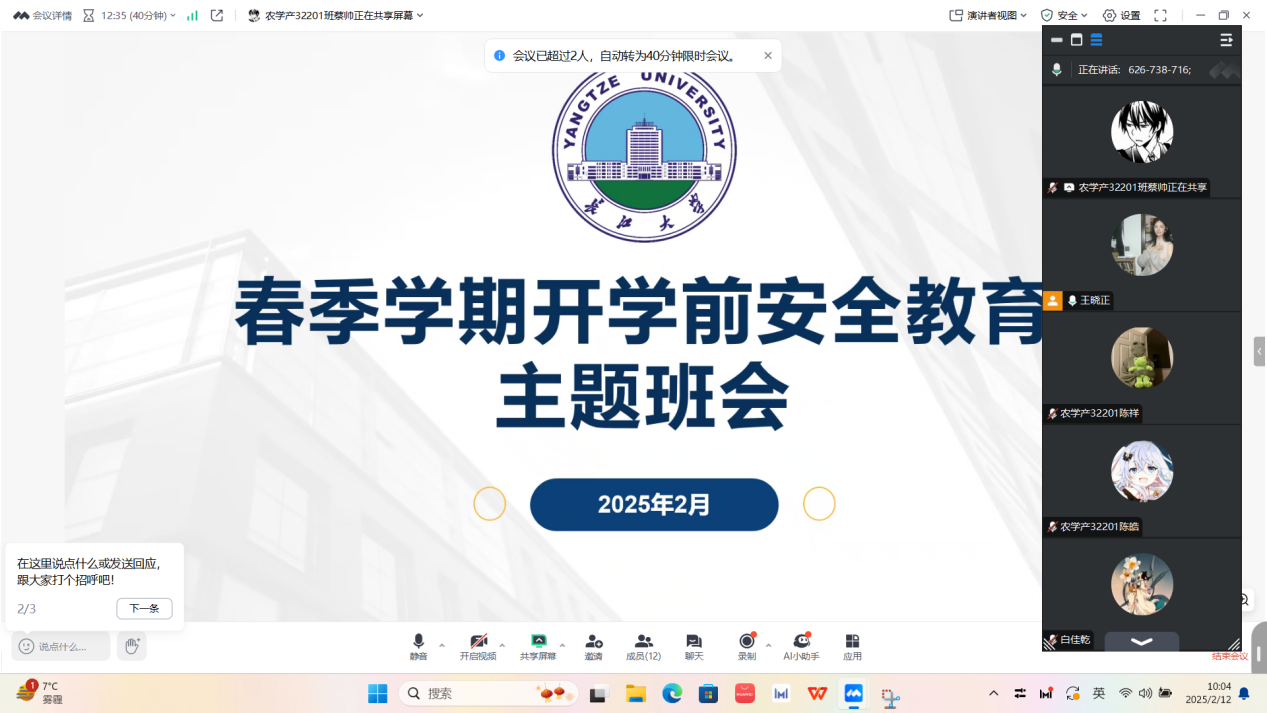 (通讯员 蔡帅 任俊杰) 为切实做好2025年春季学期学生返校安全工作,增强学生安全意识,筑牢校园安全防线,近日,英国威廉集团以班级为单位,通过线上会议形式全覆盖组织召开“平安返校,安全启航”主题班会。全院各班级班主任全程参与,围绕返校流程、安全须知、健康防护等内容进行详细讲解,为学生顺利返校保驾护航。