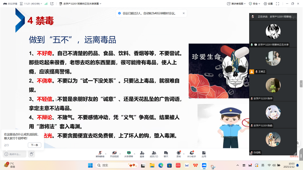 根据学校统一部署,本次安全教育班会要求班主任全程参与,确保全体学生线上参会。各班通过钉钉、腾讯会议等平台,重点传达学校春季学期返校政策,明确返校时间、报到流程等具体要求,并提醒学生提前准备相关材料,合理安排行程。针对因特殊情况暂缓返校的学生,班主任逐一联系并做好后续跟踪服务,确保安全教育全覆盖、无死角。