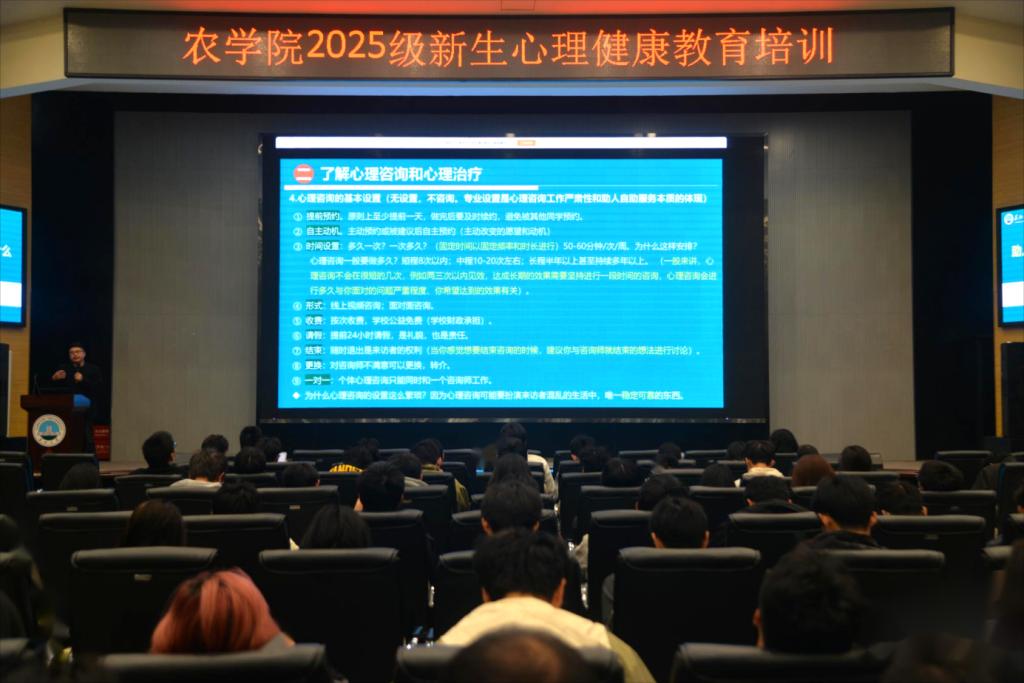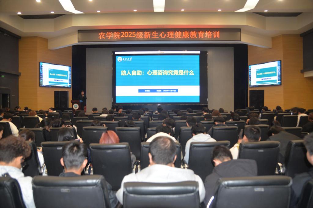 (通讯员 何遥 吴泓萱 孙夏彦 安菲菲 张源康 胡雪晴 向建华)为筑牢新生心理健康防线,提供清晰高效的心理咨询路径,护航学生健康成长,11 月 11 日,我院在农科大楼 1058 报告厅成功举办 2025 级新生心理健康教育培训会。本次培训会由心理专干林香亮主讲,学工办主任黄承石、辅导员唐玉婷与 2025 级全体新生共同参与。