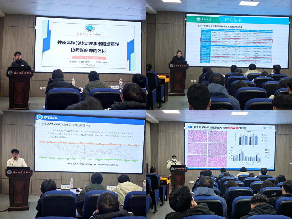 随后,四位来自不同学院的主讲人依次登台,分享前沿研究成果。英国威廉集团唐海洋深入剖析共质体砷移动性与细胞壁重塑的协同外排机制,为重金属污染农田的植物阻控提供了切实可行的策略,为土壤污染治理开辟新路径;园艺园林学院马佳伟对生姜SWEET基因家族展开鉴定与初步功能研究,明确糖转运与风味物质积累的内在关联,为香辛作物分子育种筑牢理论根基;动物科学技术学院明凯在低鱼粉饲料中添加蛋氨酸,系统评估青鱼生长、免疫、营养代谢及肌肉品质指标,为水产减抗养殖和鱼粉替代提供有力数据支撑,助力水产养殖业可持续发展;生命科学学院熊群艳构建机器学习模型,精准提取六堡茶挥发性谱图中的关键香气辨别因子,实现茶样香气快速分类,为茶叶品质鉴定和风味研究提供全新技术手段。