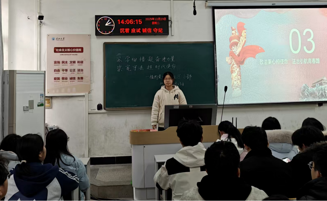 12月23日下午,植物类32502班在团支部副书记巩鑫玉的带领下于7教106积极开展团会活动。巩鑫玉创新活动形式,举办“法治精神”知识竞赛与红色观影分享会。竞赛题涵盖习近平总书记重要讲话要点与基础法律常识,观影后,同学们围绕“如何以法治护航使命”展开研讨并真切意识到唯有将深学细悟的精神力量转化为遵法守法的自觉行动,才能真正扛起时代赋予的责任。