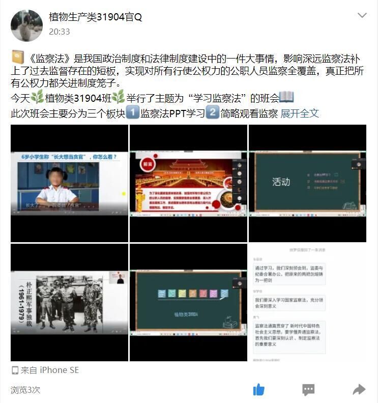 植物类31904班通过ppt及视频资料进行了学习,通过法学院杨春磊老师的精彩讲述,同学们进一步认识了监察法的深远意义,明白了监察法的未来意义。学习委员最后讲到大学生是,是社会的主要建设者,学习监察法,争做廉洁人,是我们每个大学生共同的承诺。