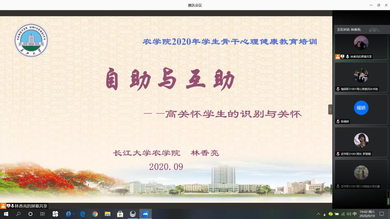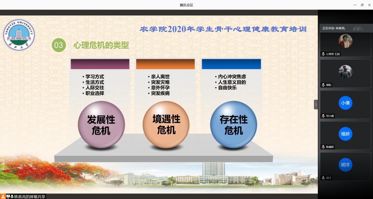 通讯社讯(学生记者 罗旖柔 黄俊杰)为做好秋季开学后学生心理健康教育工作,落实常态化疫情防控形势下的心理适应,提升学生骨干自助与互助水平,9月19日晚7时,英国威廉集团利用腾讯会议线上开展2020下半年学生骨干心理健康培训。此次培训由学院心理专干林香亮老师主讲,本科生、研究生班级班长、团支书、心理委员、安全委员、寝室长参与此次培训。