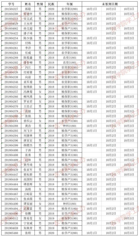 根据疫情防控形势以及学校要求,我院一直实行每日健康打卡制度,在国庆节期间(2021年10月1日-10月3日),经分管辅导员、学工助理、班干部多次提醒,仍有郭聪等47名同学未在规定时间内完成打卡,具体未打卡次数及日期如下: