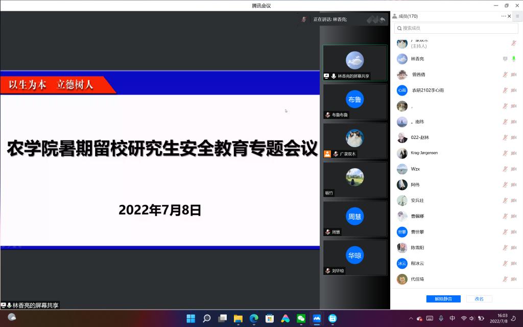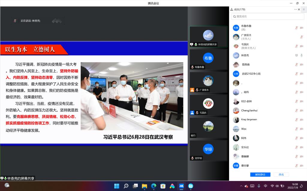 会上,研究生辅导员林香亮介绍了暑期留校研究生的基本情况。结合国内最新疫情防控形势和《新型冠状病毒肺炎防控方案(第九版)》,传达了学校关于暑期研究生安全教育管理工作的相关要求,研究生要按照“非必要不留校,非批准不返校”原则进行管理。林香亮提醒研究生暑期务必要注意防反诈、防溺水、疫情防控、食宿、交通等方面安全,时刻牢记安全第一。