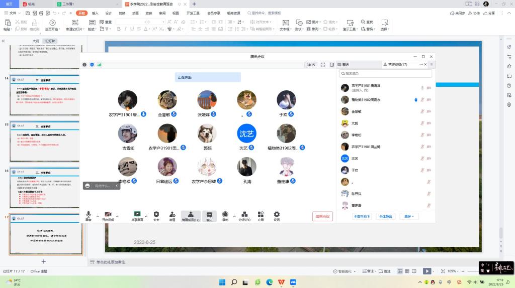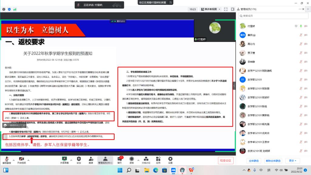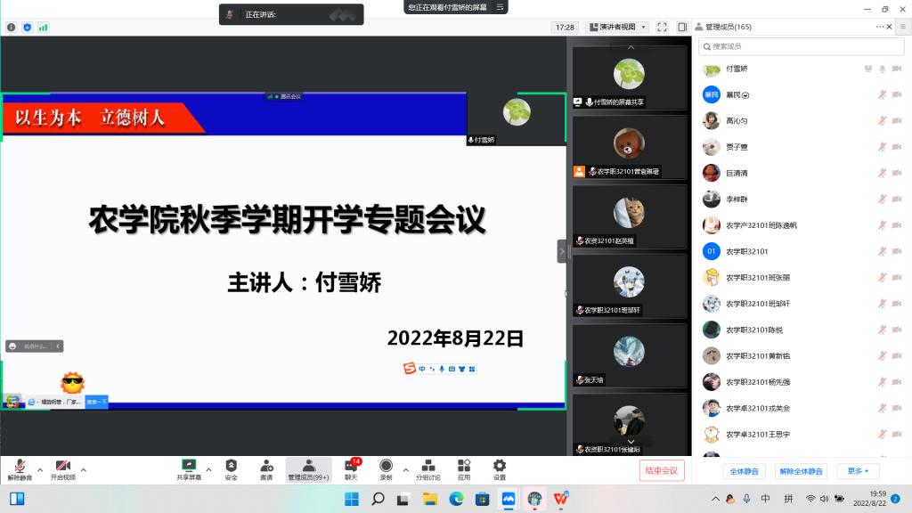 (通讯员 郝梨)为了保证学生能够安全、顺利返校,8月22日—25日,农学院采用腾讯会议分年级分班级在全院学生中召开了2022年秋季学生返校工作年级大会,会议由各年级辅导员和各班级班主任主持。