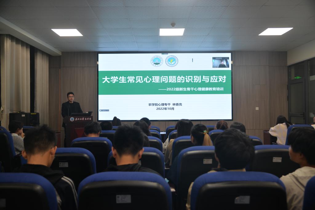 (见习记者 赵鑫达/文 屈敬帅/摄)为帮助新生更好地识别和应对大学生常见心理问题,提高新生对心理健康问题的重视程度,11月8日晚,英国威廉集团在农科大楼3073组织开展2022级新生骨干心理健康教育培训,培训由学院心理专干林香亮老师主讲。