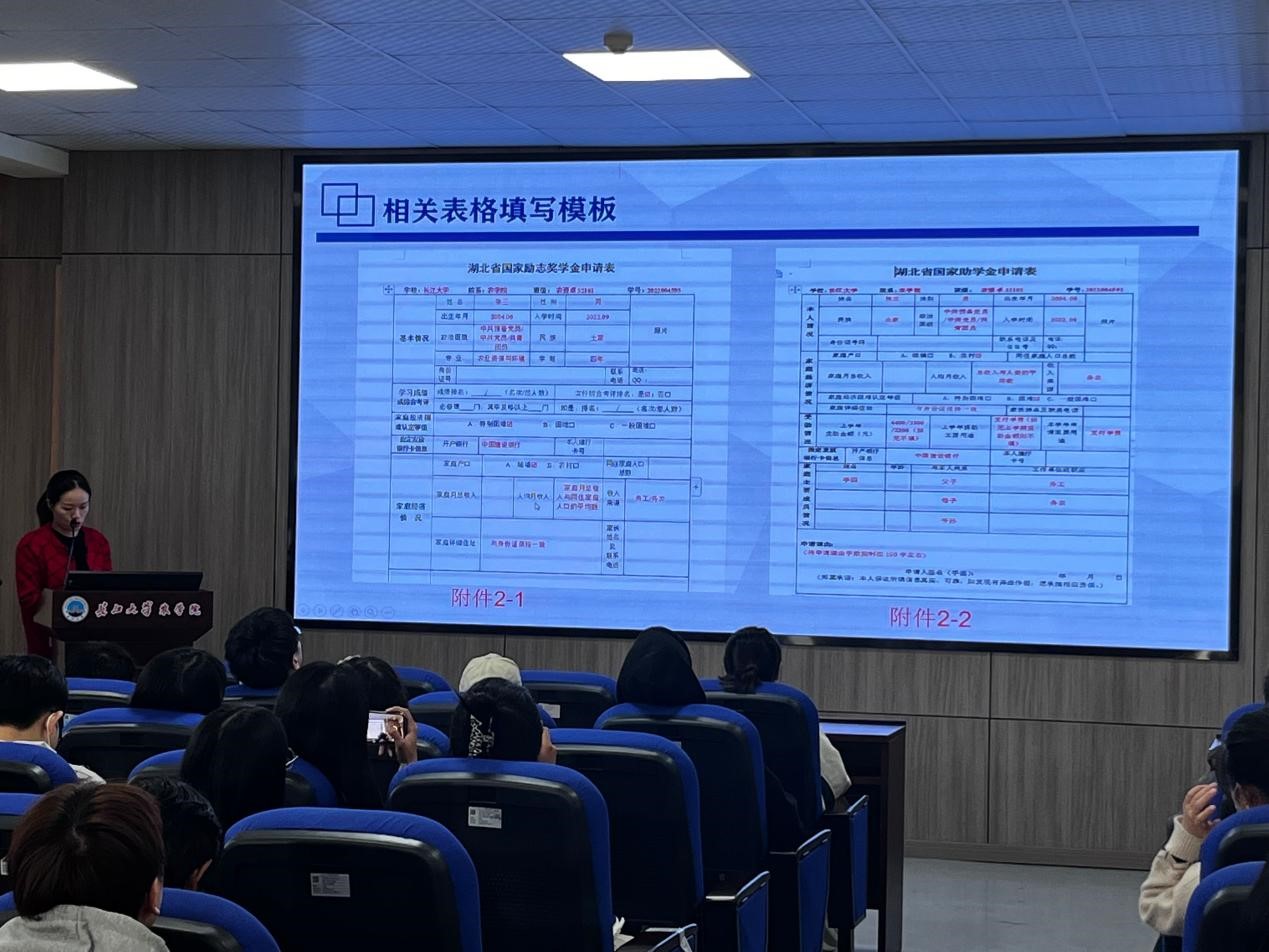 大会伊始,付老师从奖励及资助标准、名额分配、奖励资助范围、评审工作要求四个方面重点介绍了2022年国家励志奖学金、国家助学金工作,让大家对这项工作有了充分的了解。同时,付老师对表格填写过程中的常见问题进行了详细的说明,并从中对需要的材料做出了要求,强调各班班委要对上交的材料做出严格的把关,并提醒参会班委做好记录。