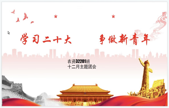 其中农资32201班于2022年12月18日在腾讯会议上开展了本次主题团会活动。在团会上主持人刘彤及各班委组织同学们开展了“学习宣传党的二十大精神”专题组织生活会,深刻把握学习宣传贯彻党的二十大精神的重大意义,更加深刻领悟“两个确立”的决定性意义,坚持不懈用习近平新时代中国特色社会主义思想武装头脑、指导实践、推动工作,更加自觉地用党的二十大精神统一思想、统一意志、统一行动,紧跟习近平总书记奋进新征程、建功新时代。此次团会让同学们意识到学习二十大,争做新青年,这是十分贴近大学生思想的话题,秉承着社会荣辱观、社会主义四有公民的要求,大学生必须严格要求自己,做身心健康、品质优良、爱国敬业的优秀大学生。而本次主题团会的召开,恰好提醒、号召了身为大学生的团员们要紧跟党走,做爱国大学生,经过这次团会的召开,同学们更是对中国共产党第二十次全国代表大会有了更加详细而深刻的了解,为个人理想及目标的确立和实现起了一定的作用。同学们也纷纷表示,要积极响应国家号召,放假返乡后面向返回的乡镇、街道进行宣讲,推动党的二十大精神走进基层、走进群众。