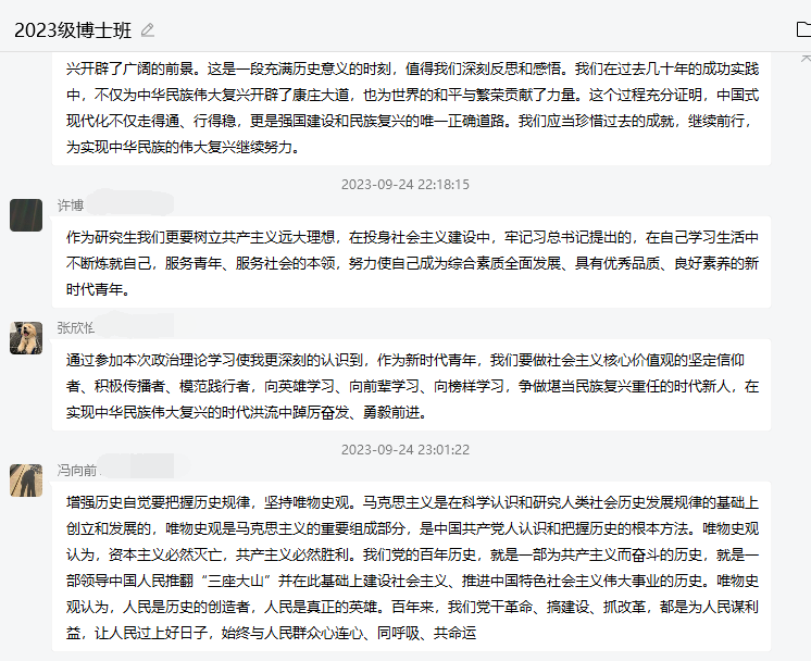 学习活动以班级为单位组织开展。各研究生仔细研读了习近平总书记在新疆维吾尔自治区党委和政府的报告,深切体会到新疆不仅作为中国美丽的疆土而存在,还担负着在中国式现代化进程中的重大使命;各班级集中学习了《高等学校预防不端与处理学术行为办法》,学习了校党委书记王建平在领导干部警示教育大会上的讲话和校长刘勇胜在新学期工作部署会议上的讲内容。