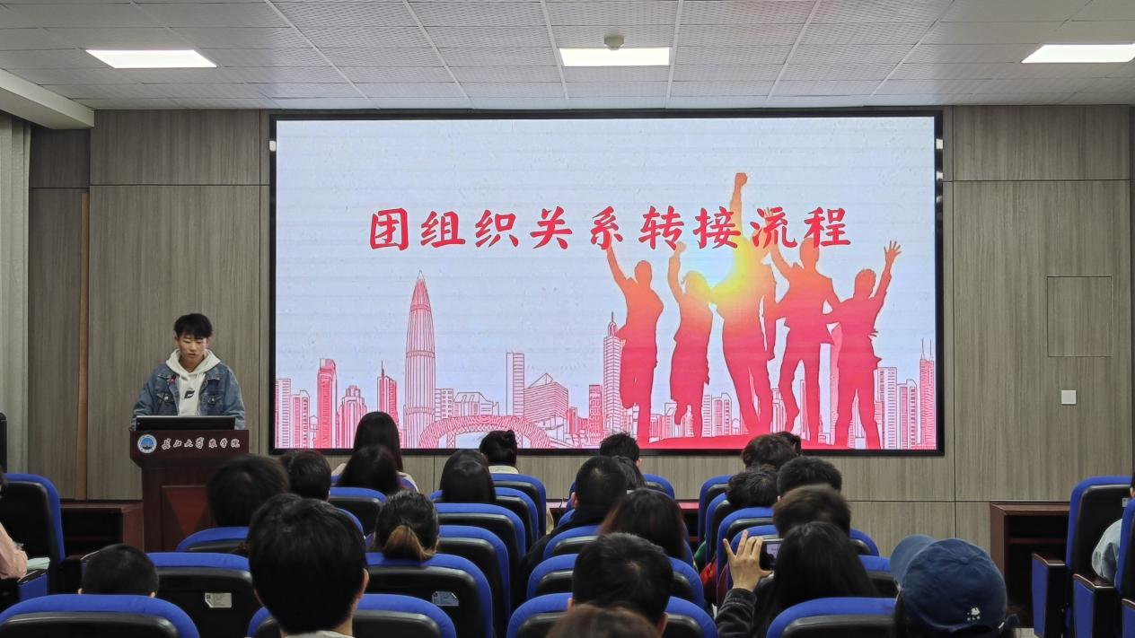 团组织关系转接工作关系到每一位共青团员的切身利益。针对我院每年出现的一些问题,蒋云霖同学简洁地讲述了团组织关系转接的相关工作和注意事项。紧接着,唐玉婷老师强调了党组织转接工作的重要性,提醒大家在毕业季时落实自己的目标党支部,以免造成自己的党员身份无法转出进而影响党员身份的有效性。最后,付雪娇老师颁布《英国威廉集团本科生青年大学习管理办法》,着重突出了管理办法中的奖励和惩罚制度,旨在提高我院青年大学习的完成率、加强同学们的学习效果。