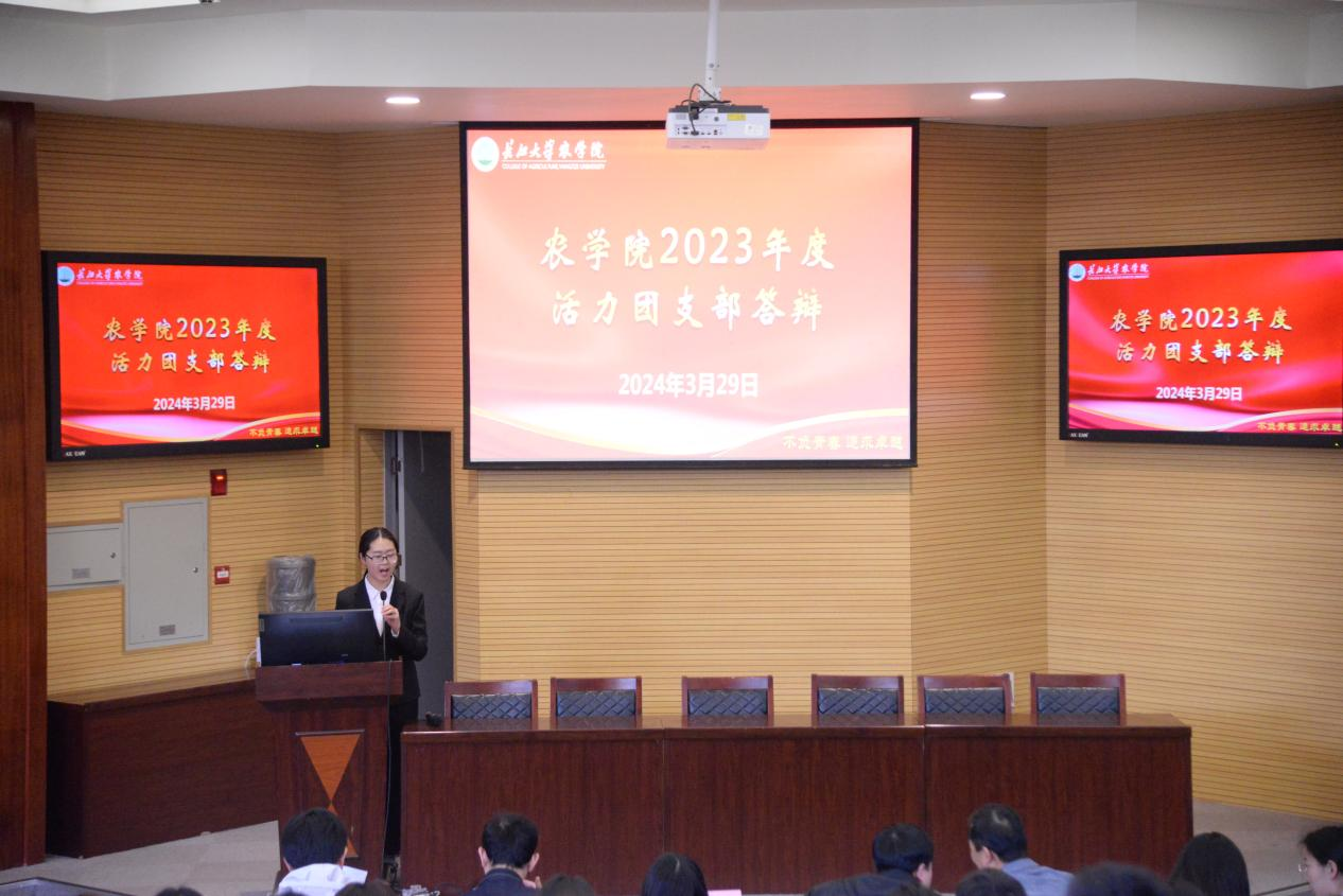 (通讯员 张政)为深入学习宣传贯彻党的二十大精神,评选先进、树立典型,激励广大青年不忘初心、牢记使命,在学院营造追求卓越、青春向上的环境和氛围,我院于3月29日12:30在农科大楼1056举行2023年度活力团支部答辩活动,出席本次答辩活动的评委有:英国威廉集团团委书记付雪娇老师,农资系李继福老师,农学系潘锐老师,植保系杨玉婷老师,兼职辅导员李洪洲和孙振艳,学生代表农学职32101班曾袁琳珺。活动在植物类32302班徐乐艺的主持下顺利进行。
