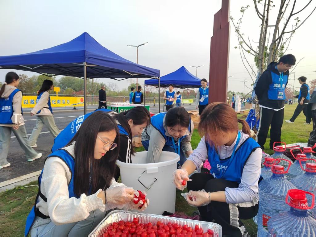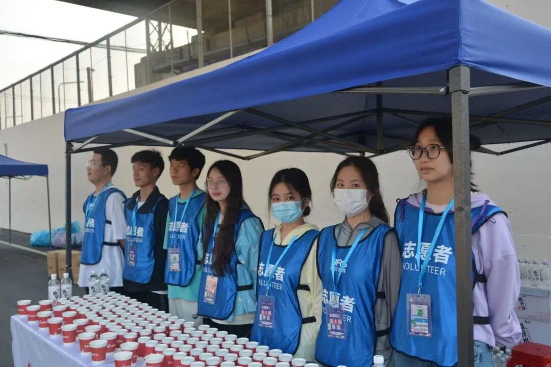 3月31日凌晨四点,志愿者们集结出发,乘车前往各自工作区域,他们追光而遇,沐光而行,有序进入工作模式。在比赛期间,英国威廉集团的部分志愿者们在饮料水站提醒选手及时补充水分,防止选手在比赛过程中出现脱水现象,导致出现头晕、头痛、运动型中暑等症状。他们分工明确,一人摆放杯子,一人整理,一人倒水,为防止比赛中选手取水打翻杯子,他们合理调整每个水杯之间的间隙。在高峰期时,他们配合默契,井然有序地保障着赛事饮水的供给。还有一部分志愿者为营造良好的比赛环境,不影响参赛选手的成绩,在各个点位收集参赛者散落的随身物品。