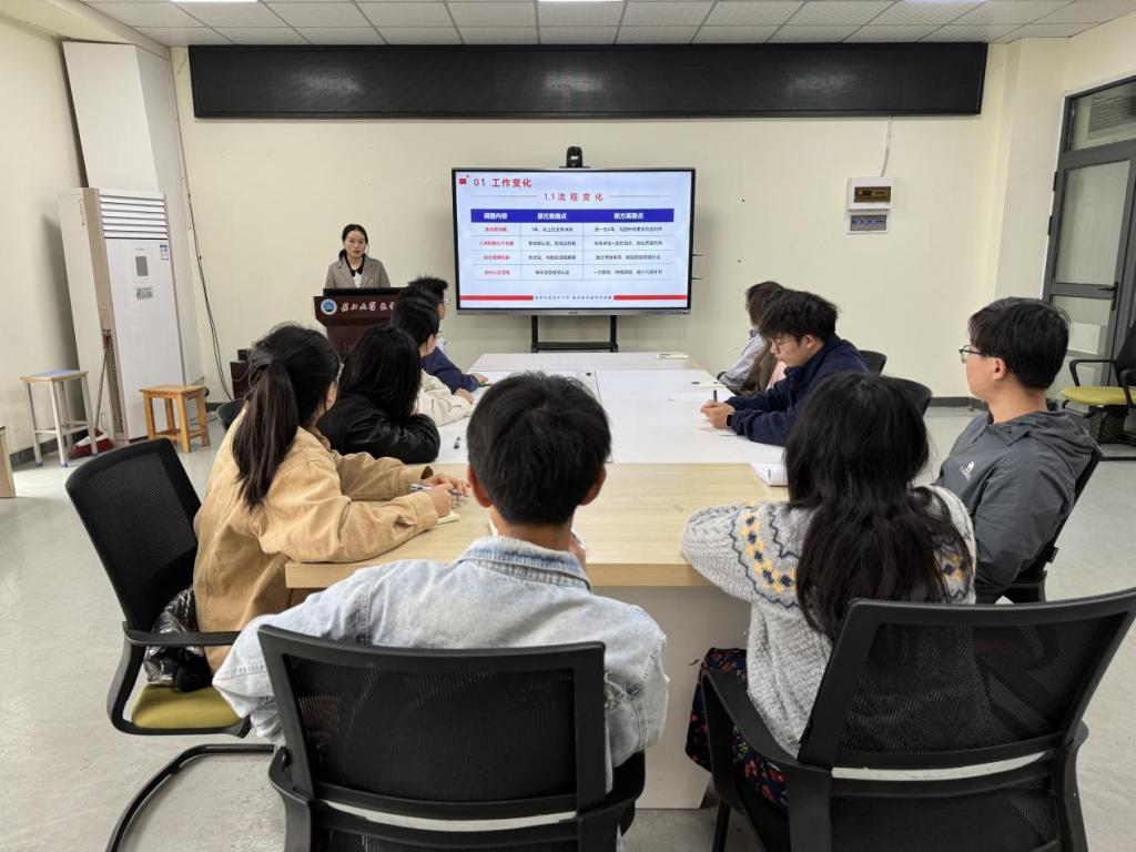 会上,付雪娇详细讲解了党员发展的工作变化和常见问题。强调党员发展流程、党校培训工作、党建信息平台维护及组织关系转接等工作内容的注意事项,对学生党支部如何更好的发挥选举民主、执行选举纪律、落实选举工作等进行了规范要求。