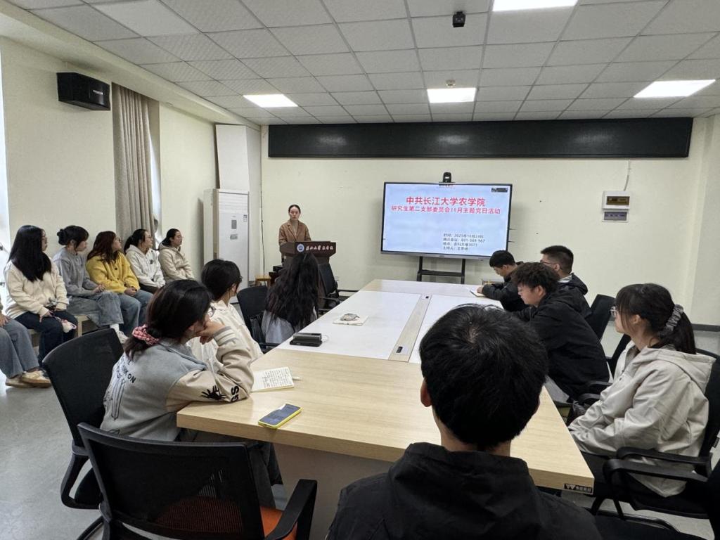 (通讯员 任娇 李嘉萍)10月24日,我院研究生第二党支部在农科大楼3071会议室开展10月份主题党日活动,活动结合腾讯会议(ID:655 880 636)同时在线上召开。全体在校党员和校外联培党员共同参与,活动由王思婷同志主持。