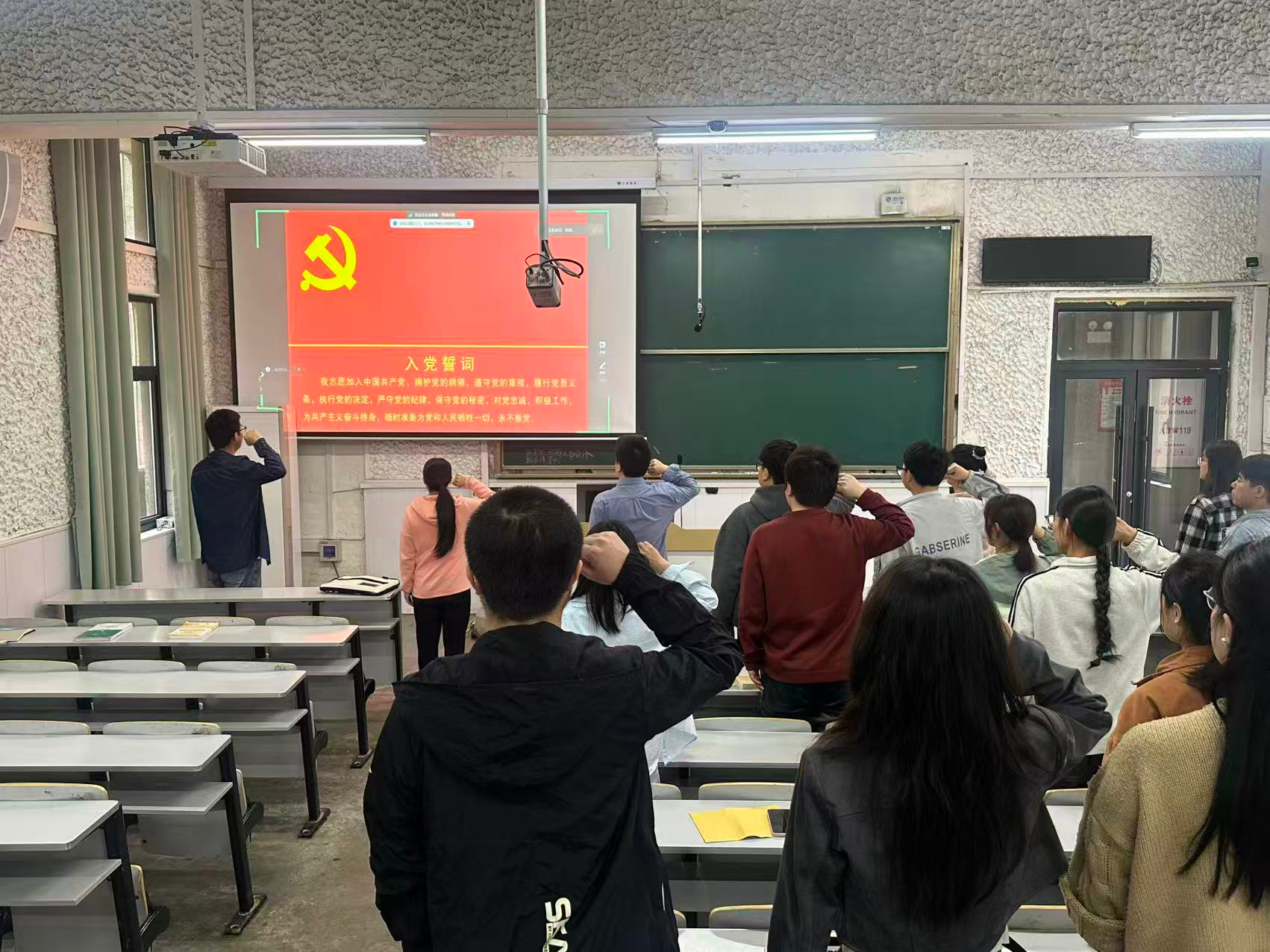 会议第一项,开展毕业生预备党员接受大会。会议按照接收预备党员的组织程序进行,发展对象宗召英同志宣读《入党志愿书》,并向党组织汇报自身情况;入党介绍人史庆潇同志介绍发展对象的培养考察情况并进行客观的评价;与会正式党员以无记名投票的方式进行表决,共发放表决票9张,收回表决票9张,最终,同意接收宗召英1名发展对象为中共预备党员。新发展的预备党员佩戴党员徽章后,在卜令钊同志的带领下,面向党旗,庄严宣誓。