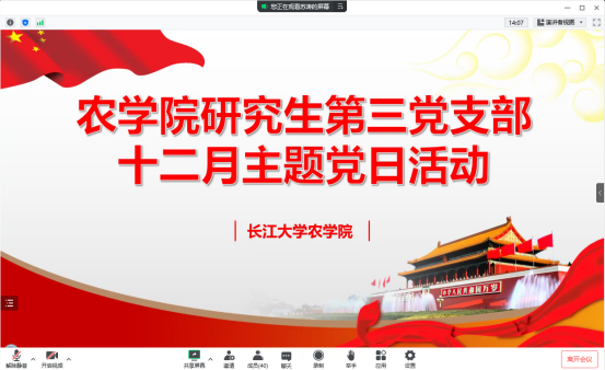 (通讯员 邹宇傲)12月14日中午12:00,我院研究生第三党支部开展12月主题党日活动。活动通过腾讯会议线上进行,党支部全体党员均参与此次活动,本次活动由组织委员苏涛同志主持。