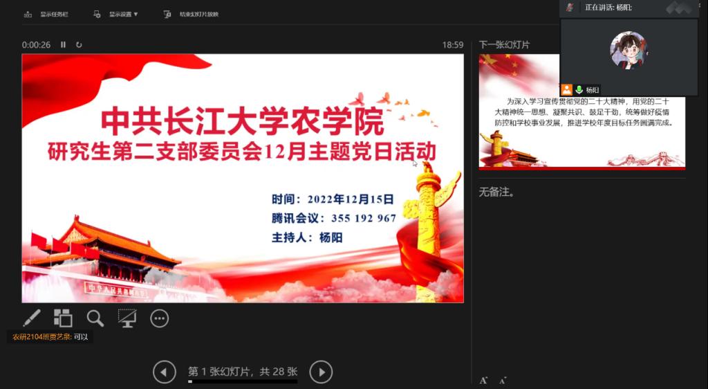 (通讯员 曹佩娜 宋梦圆)12月15日晚上7点,我院研究生第二党支部以腾讯会议(ID:355192967)的方式在线上召开十二月份主题党日活动。全体在校党员和校外联培党员参与此次活动,活动由支部副书记杨阳同志主持。