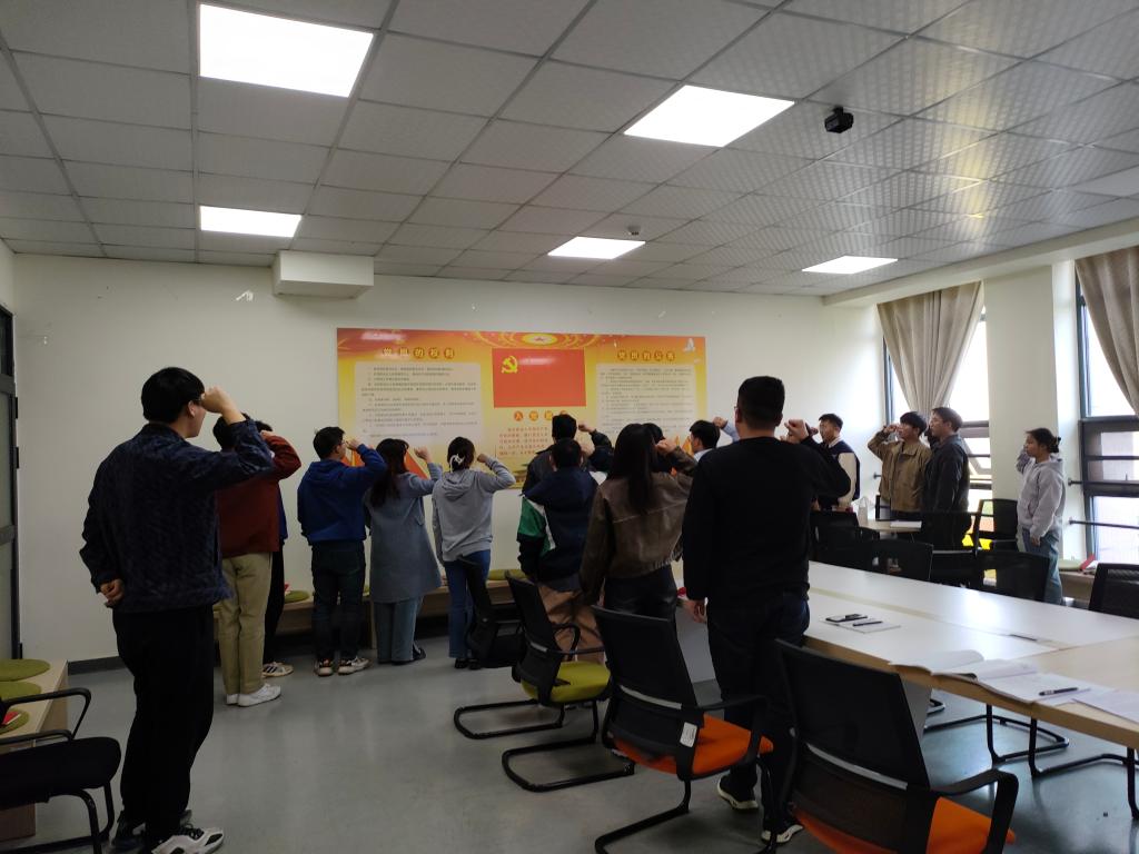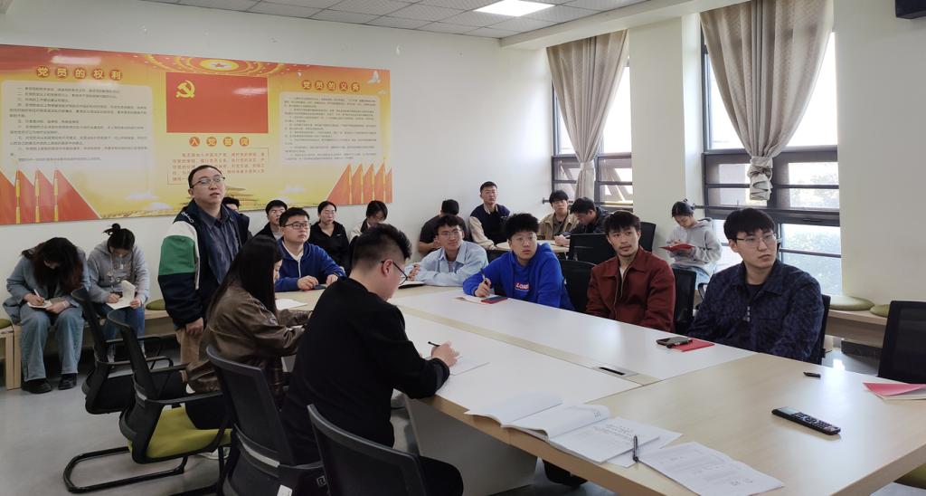 组织委员张银带领全体党员重温入党誓词。纪检委员罗丽娅对本月党费交纳情况进行简要说明。陈子方诵读《中国共产党章程(修正案)》第二章相关内容。邓元凯为全体党员讲《为推进中国式现代化注入强大动力》微党课。罗丁钒、王秋实、唐海洋等领学《习近平在2024年春季学期中央党校(国家行政学院)中青年干部培训班开班之际作出重要指示强调》相关内容。柴梦莹、张银、邹雨婷等围绕“作为一名党员,结合学校2024年工作要点,如何发挥党组织战斗堡垒作用和党员先锋模范作用,巩固拓展主题教育成果”谈心得体会。