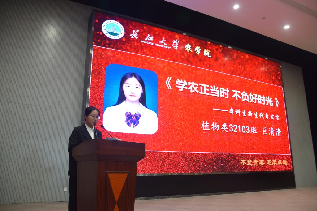 植物类32103班巨清清和农研2104班贾艺泉同学分别作为本科生和研究生新生代表发言。她们对开学时老师同学们的辛苦付出以及入学后学校无微不至的关怀表示衷心的感谢,表达了对大学生活的期待与憧憬,呼吁全体新生要有勤学躬行的决心,坚韧不拔的毅力,敏而好学的热情,脚踏实地的实践力。贾艺泉同学提到当今社会智慧农业是摆在我们面前的新课题,我们所有学农人需要坚定目标、积累知识为探索未知提供路径。